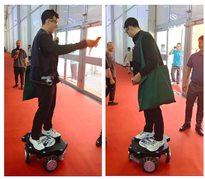 展会中,一位外国观众站上全向轮底盘,在模拟重载场景下,底盘带他平稳转向、灵活穿行,精准无滞涩。这一幕被拍下,成了大会 “技术名场面”。